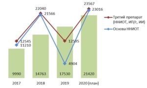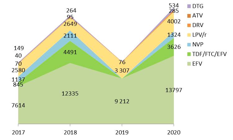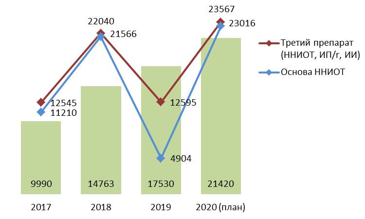 Планируется дальнейший рост охвата антиретровирусной терапией: если на 01.11.2019 терапию получали около 17,5 тысяч человек (80,4% от 21,8 тыс. ЛЖВ, состоящих на диспансерном учете), то в 2020 году планируется закупить препараты на 23,5 тысячи человек («третьих» препаратов в схеме – на 23 567 годовых курсов, «препаратов основы» – на 23 016 годовых курсов).