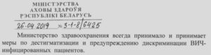 Скриншот письма Минздрава Беларуси в ответ на обращение БОО «Позитивное движение» по поводу указания ВИЧ-положительного статуса в медицинских справках