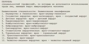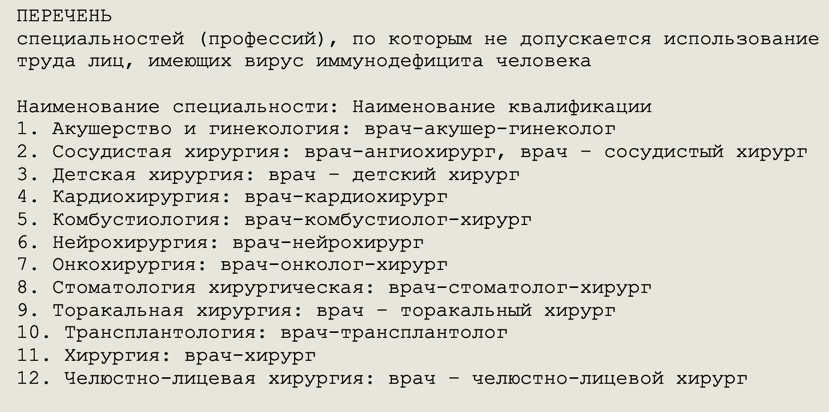 Наличие ВИЧ-инфекции является противопоказанием к работе врачами хирургических специальностей [1]. Но никак не противопоказанием к получению медицинского образования: ВИЧ-положительные люди могут обучаться в медицинских вузах и медицинских училищах.